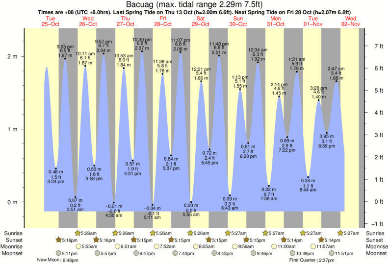 Tide Times are PST (UTC +8.0hrs). Last Spring High Tide at Bacuag was on Sun 07 Dec (height: 2.20m 7.2ft). Next high Spring Tide at Bacuag will be on Mon 22 Dec (height: 1.99m 6.5ft).