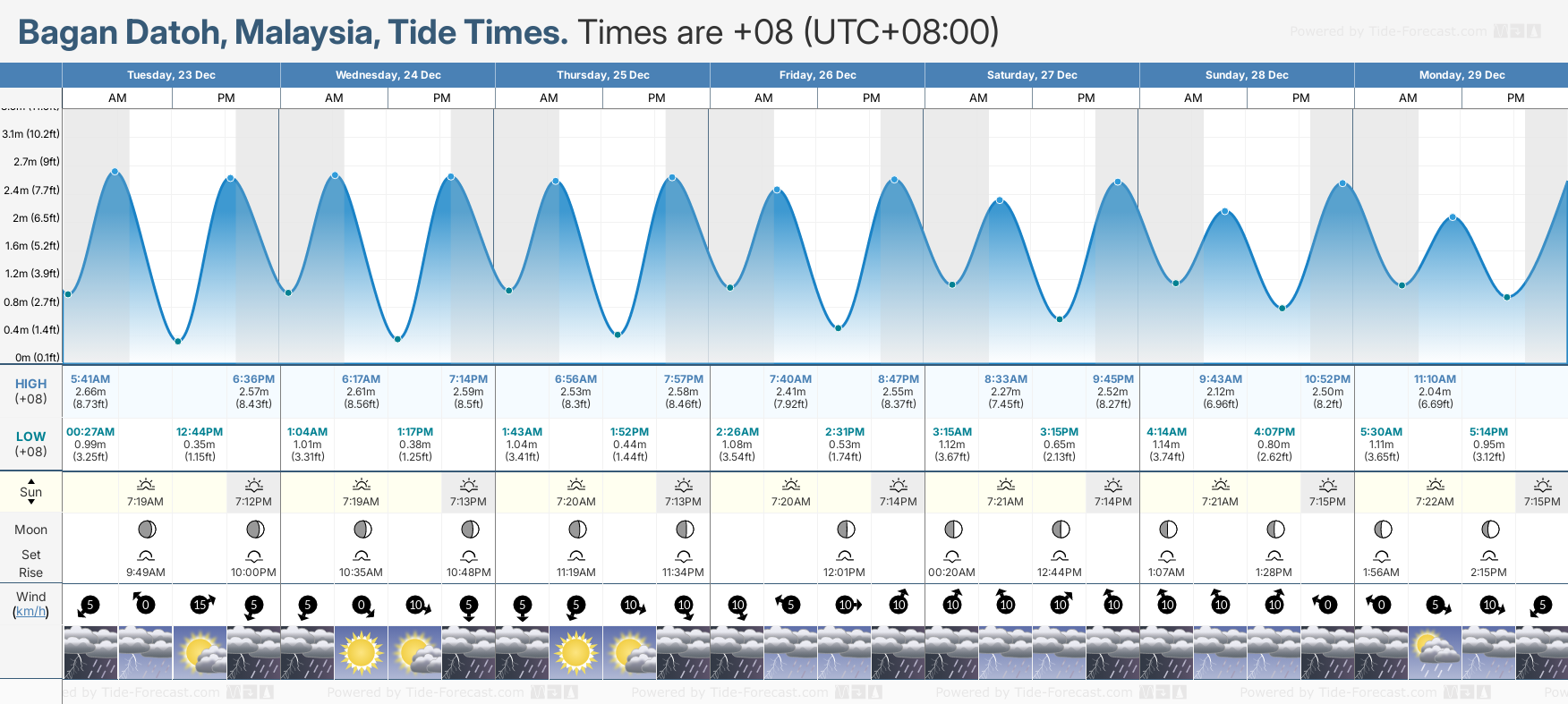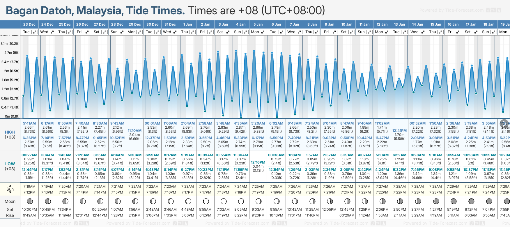 December and January Tide charts for Bagan Datoh: The tide charts below show the height, time and date of high and low tides for the next 30 days.