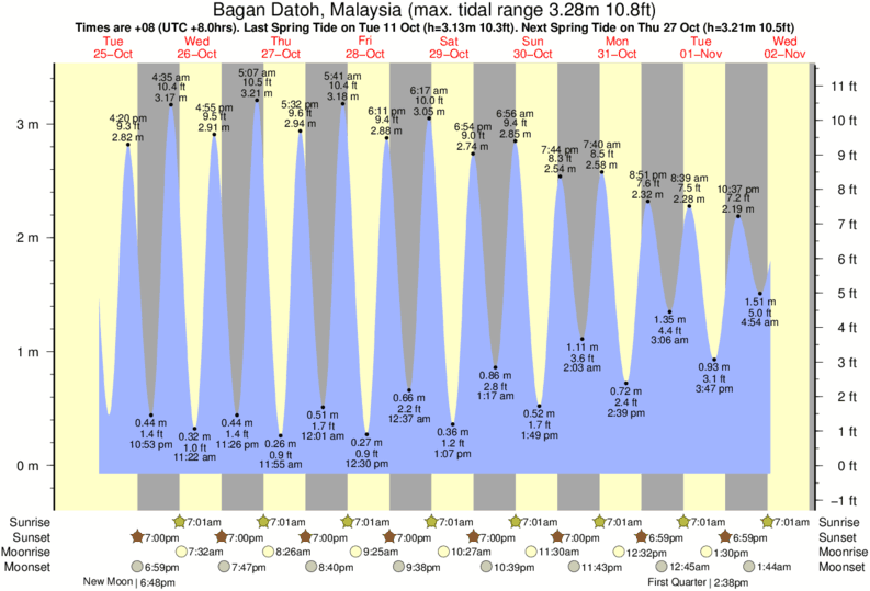 Tide Times are +08 (UTC +8.0hrs). Last Spring High Tide at Bagan Datoh was on Fri 05 Dec (height: 3.09m 10.1ft). Next high Spring Tide at Bagan Datoh will be on Sun 21 Dec (height: 2.67m 8.8ft).