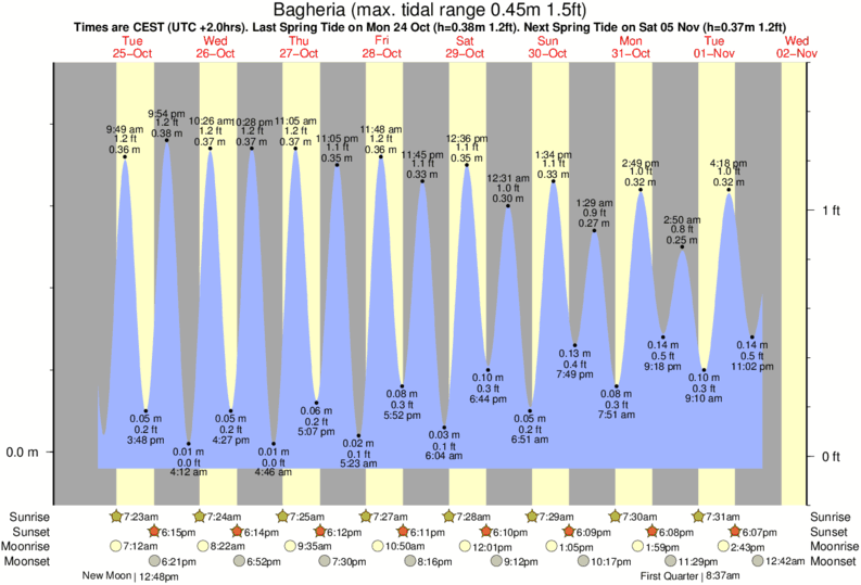 Tide Times are CET (UTC +1.0hrs). Last Spring High Tide at Bagheria was on Sun 21 Dec (height: 0.35m 1.1ft). Next high Spring Tide at Bagheria will be on Sun 04 Jan (height: 0.41m 1.3ft).