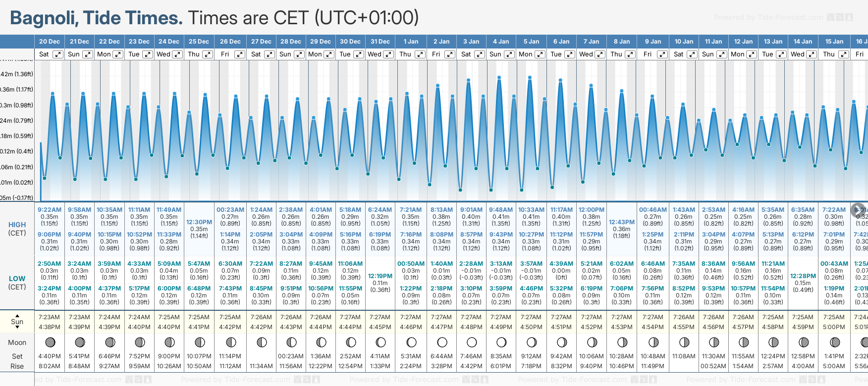 December and January Tide charts for Bagnoli: The tide charts below show the height, time and date of high and low tides for the next 30 days.