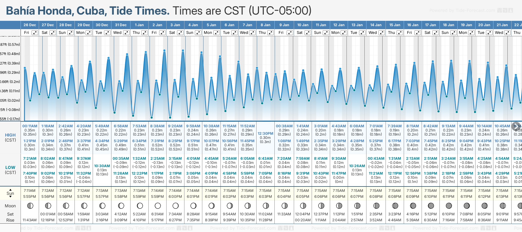 Tide Times are CST (UTC -5.0hrs). Last Spring High Tide at Bahia Honda was on Sun 21 Dec (height: 0.46m 1.5ft). Next high Spring Tide at Bahia Honda will be on Fri 02 Jan (height: 0.52m 1.7ft).