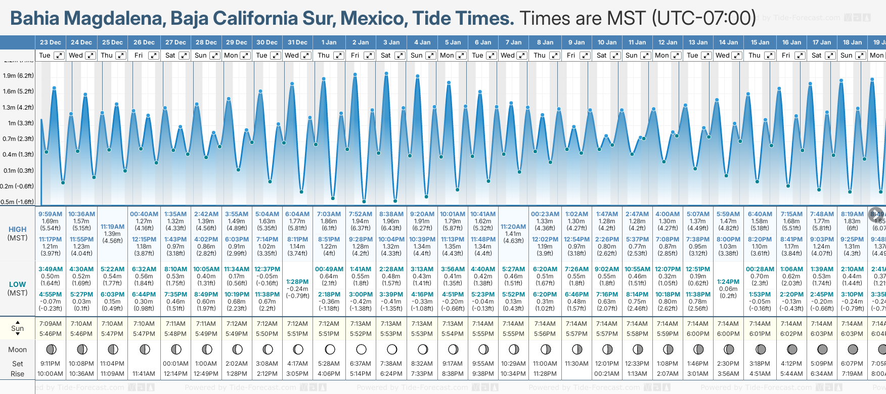 Tide chart for Bahia MagdalenaShowing low and high tide times for the next 30 days at Bahia Magdalena. Tide Times are MST (UTC -7.0hrs).