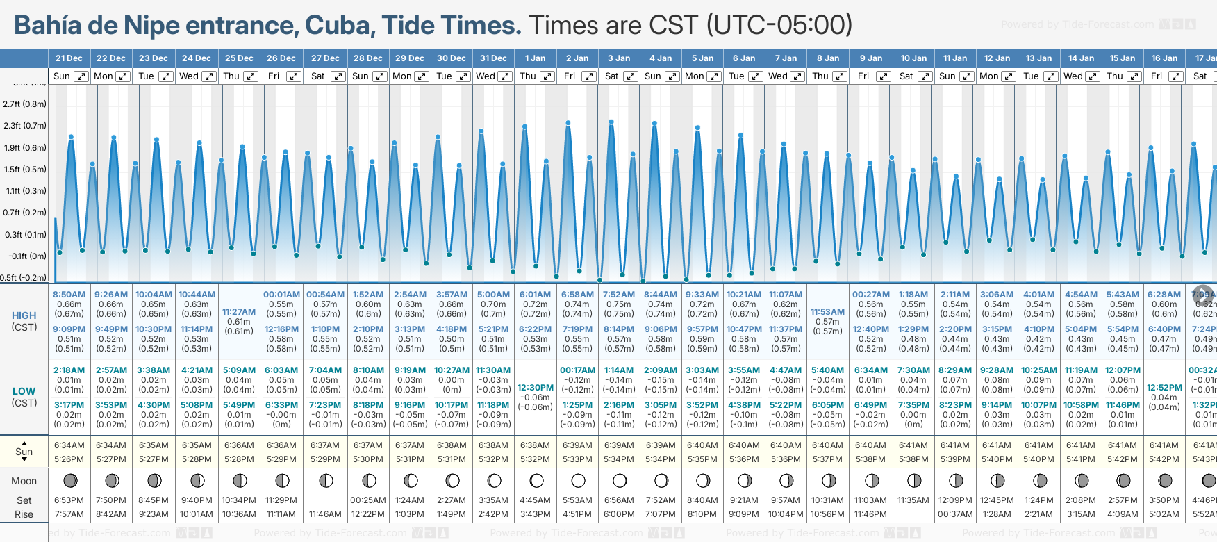 December and January Tide charts for Bahia de Nipe entrance: The tide charts below show the height, time and date of high and low tides for the next 30 days.