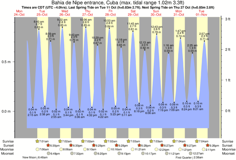 Bahia de Nipe entrance tide chart key: The tide chart above shows the height and times of high tide and low tide for Bahía de Nipe entrance, Cuba. The grey shading corresponds to nighttime hours between sunset and sunrise at Bahia de Nipe entrance.