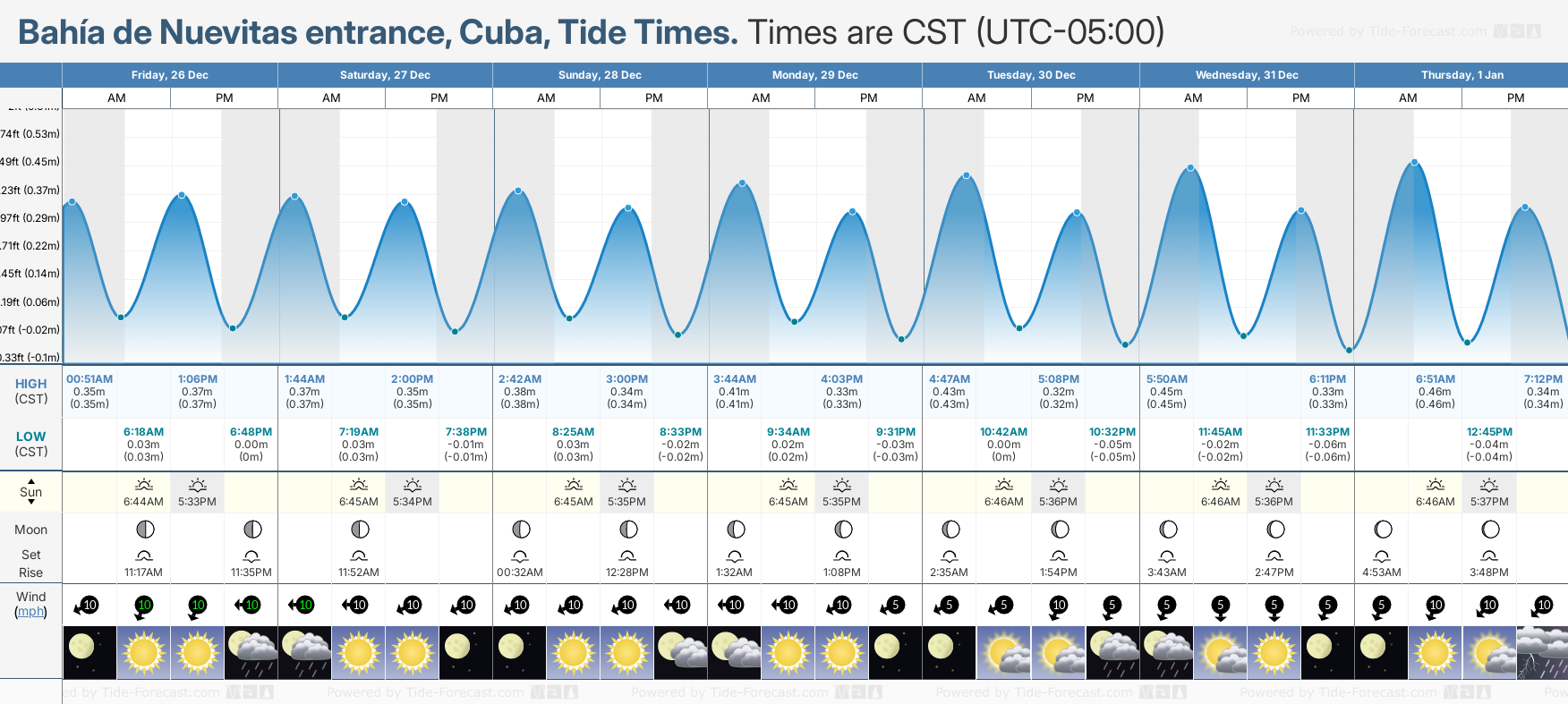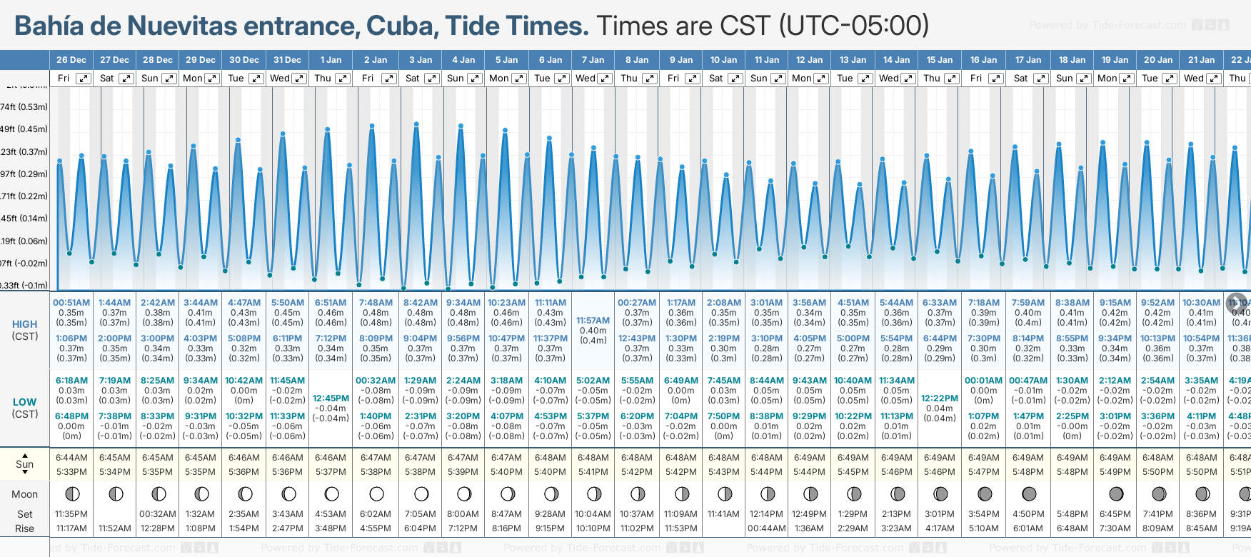 December and January Tide charts for Bahia de Nuevitas entrance: The tide charts below show the height, time and date of high and low tides for the next 30 days.