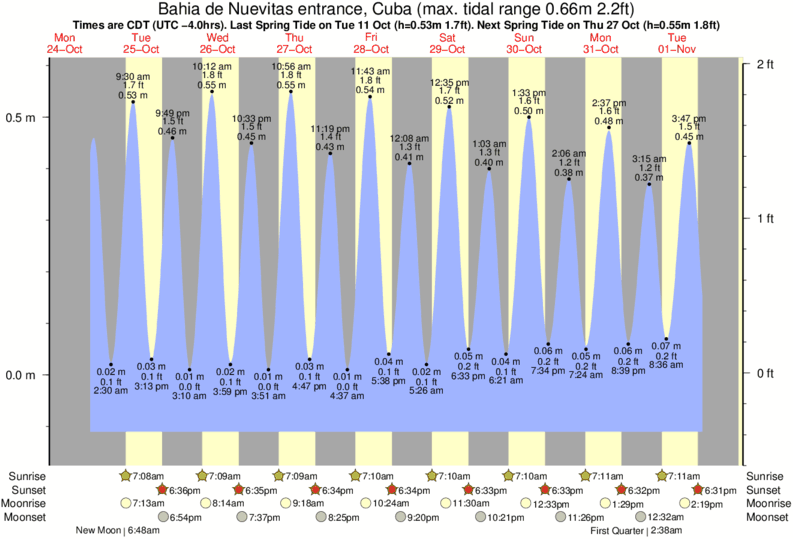 Tide Times are CST (UTC -5.0hrs). Last Spring High Tide at Bahia de Nuevitas entrance was on Fri 05 Dec (height: 0.53m 1.7ft). Next high Spring Tide at Bahia de Nuevitas entrance will be on Sun 21 Dec (height: 0.43m 1.4ft).