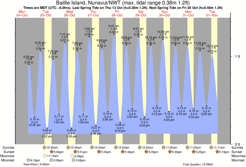Tide Times are MST (UTC -7.0hrs). Last Spring High Tide at Baillie Island was on Mon 08 Dec (height: 0.39m 1.3ft). Next high Spring Tide at Baillie Island will be on Wed 24 Dec (height: 0.37m 1.2ft).