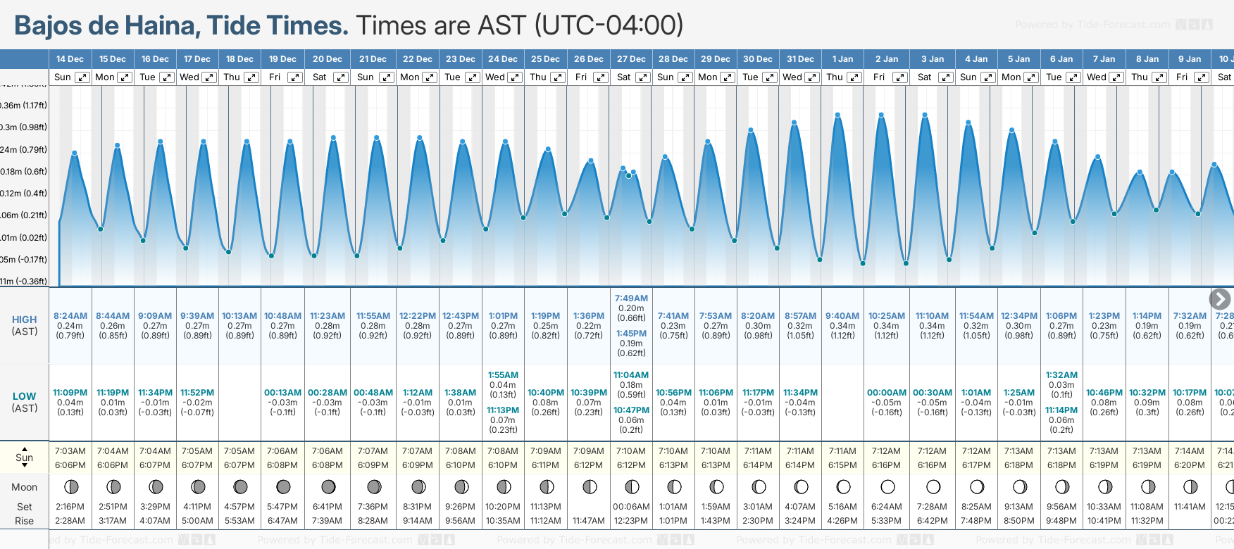 Tide chart for Bajos de HainaShowing low and high tide times for the next 30 days at Bajos de Haina. Tide Times are AST (UTC -4.0hrs).