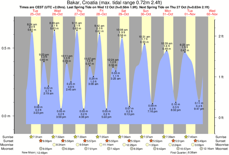 Tide Times are CET (UTC +1.0hrs). Last Spring High Tide at Bakar was on Sat 20 Dec (height: 0.62m 2.0ft). Next high Spring Tide at Bakar will be on Wed 31 Dec (height: 0.63m 2.1ft).