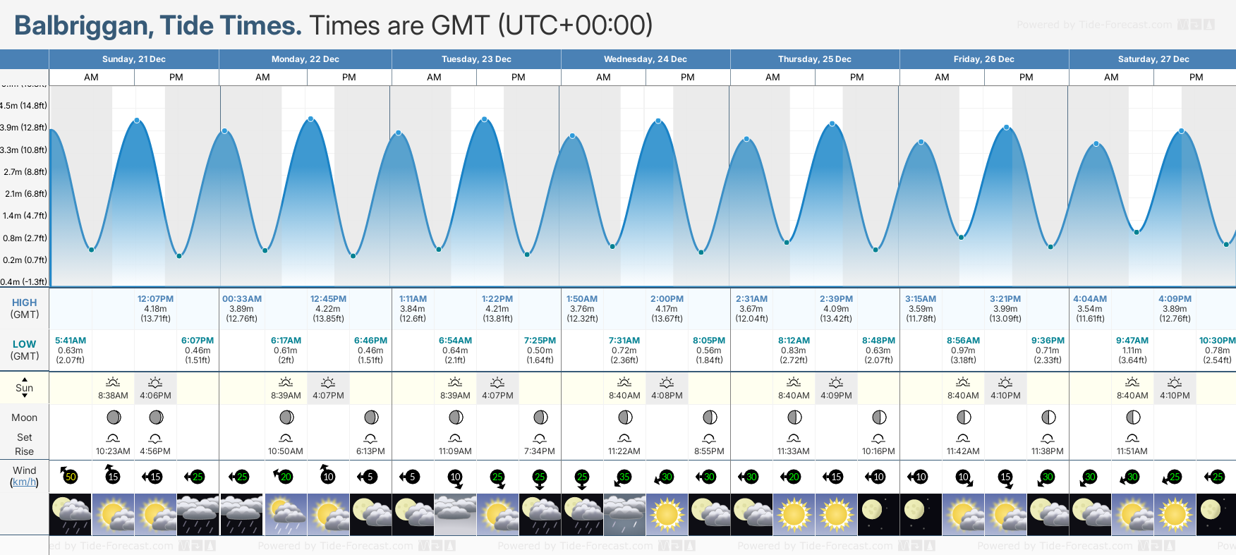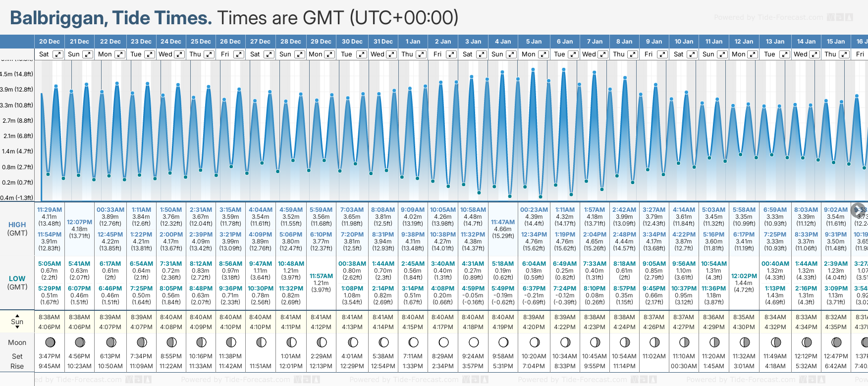 December and January Tide charts for Balbriggan: The tide charts below show the height, time and date of high and low tides for the next 30 days.