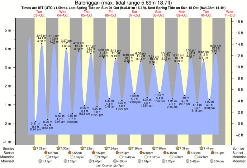 Tide chart for BalbrigganShowing low and high tide times for the next 30 days at Balbriggan. Tide Times are IST (UTC +0hrs).