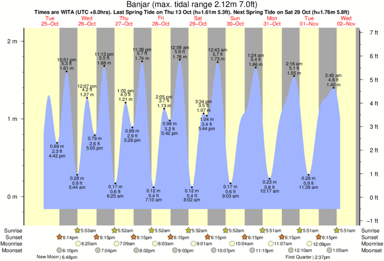 December and January Tide charts for Banjar: The tide charts below show the height, time and date of high and low tides for the next 30 days.