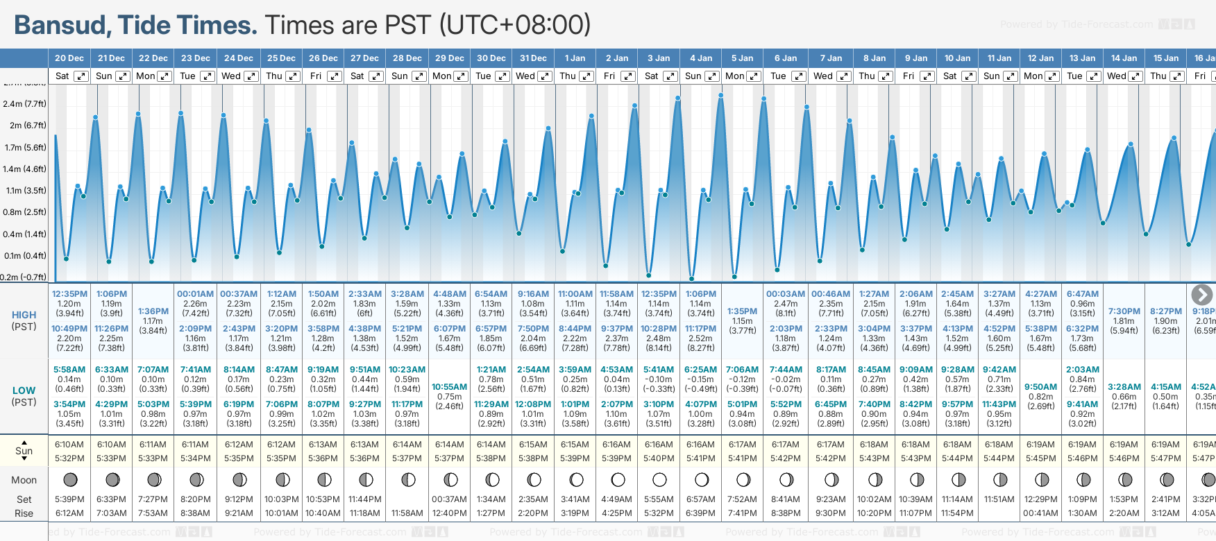 December and January Tide charts for Bansud: The tide charts below show the height, time and date of high and low tides for the next 30 days.