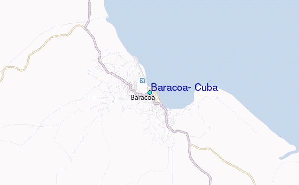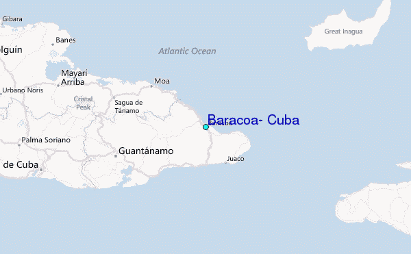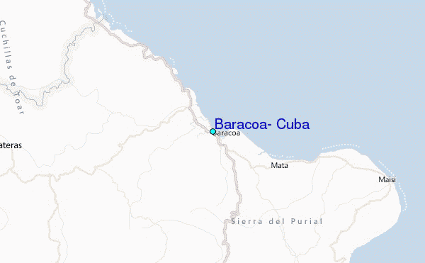 Use this relief map to navigate to tide stations, surf breaks and cities that are in the area of Baracoa, Cuba.