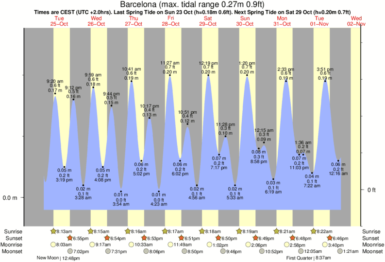 Tide Times are CET (UTC +1.0hrs). Last Spring High Tide at Barcelona was on Sun 07 Dec (height: 0.24m 0.8ft). Next high Spring Tide at Barcelona will be on Sun 21 Dec (height: 0.21m 0.7ft).