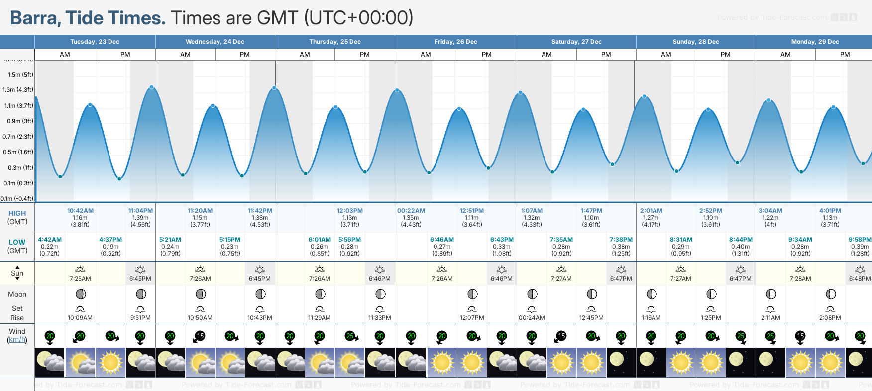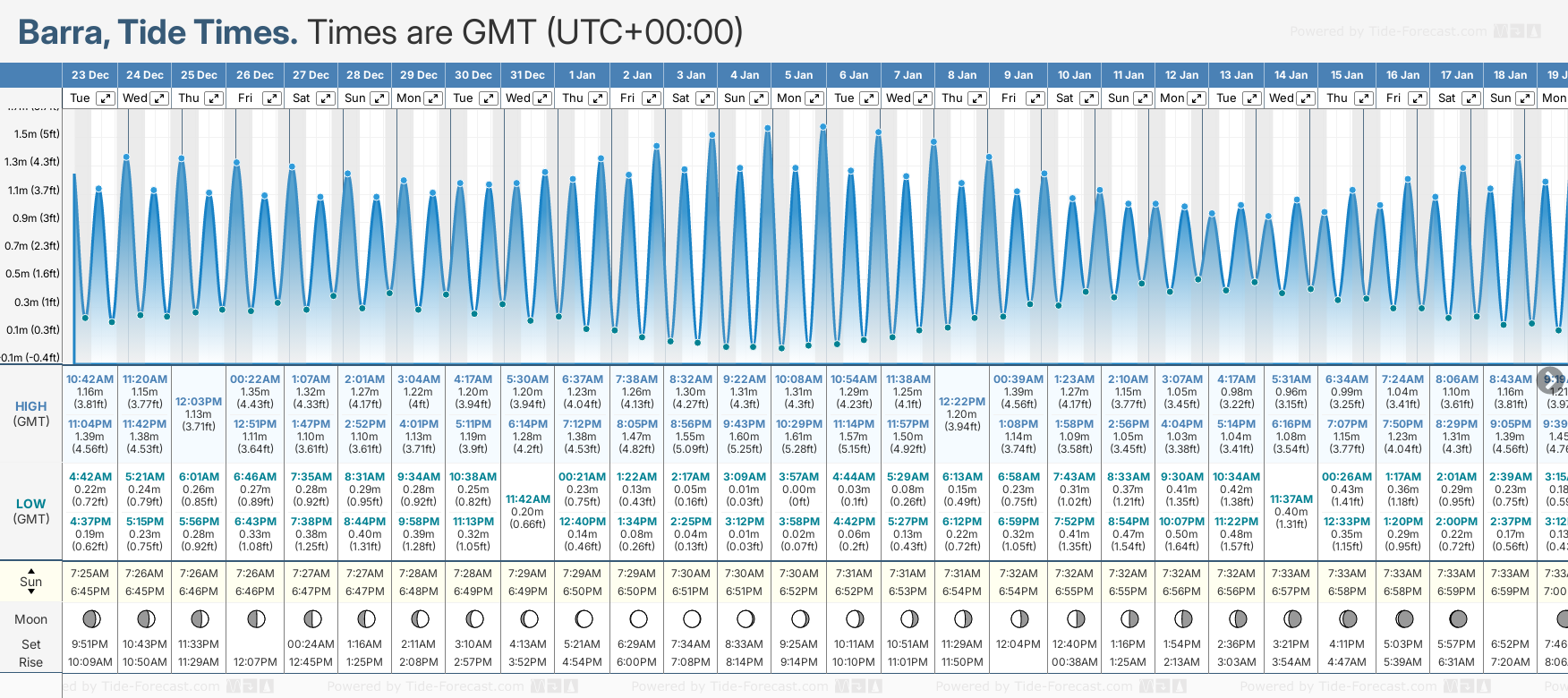 December and January Tide charts for Barra: The tide charts below show the height, time and date of high and low tides for the next 30 days.