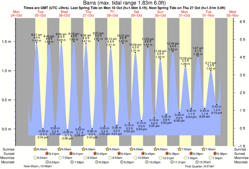 Tide Times are GMT (UTC +0hrs). Last Spring High Tide at Barra was on Sat 06 Dec (height: 1.57m 5.2ft). Next high Spring Tide at Barra will be on Mon 22 Dec (height: 1.39m 4.6ft).