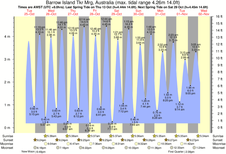 Tide chart for Barrow Island Tkr MrgShowing low and high tide times for the next 30 days at Barrow Island Tkr Mrg. Tide Times are AWST (UTC +8.0hrs).