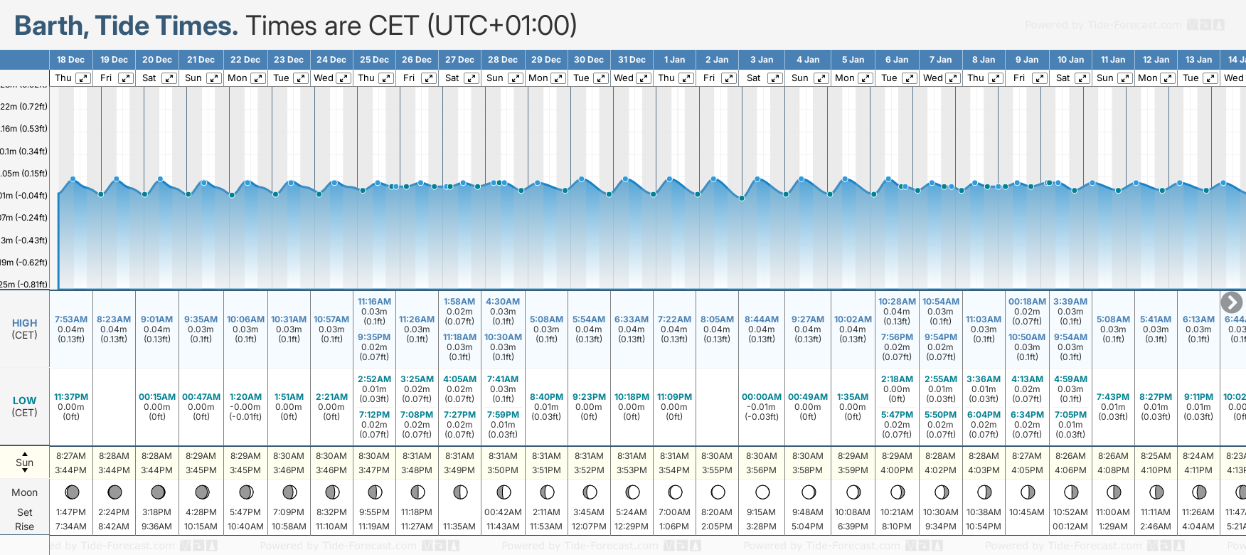 December and January Tide charts for Barth: The tide charts below show the height, time and date of high and low tides for the next 30 days.
