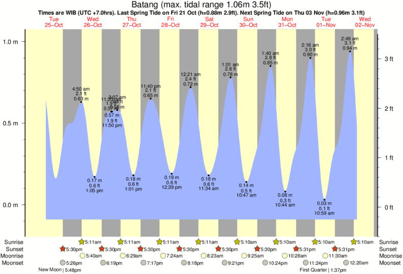 Tide Times are WIB (UTC +7.0hrs). Last Spring High Tide at Batang was on Thu 11 Dec (height: 0.95m 3.1ft). Next high Spring Tide at Batang will be on Thu 25 Dec (height: 0.90m 3.0ft).
