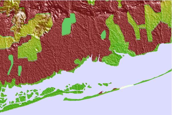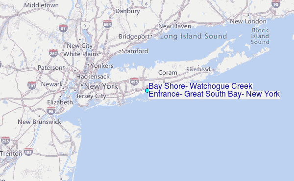 Use this relief map to navigate to tide stations, surf breaks and cities that are in the area of Bay Shore, Watchogue Creek Entrance, Great South Bay, New York.