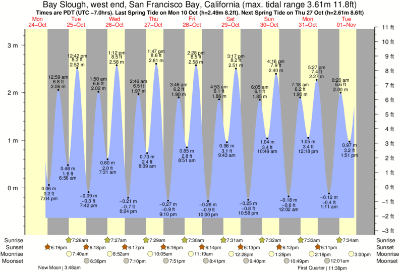 Tide Times are PST (UTC -8.0hrs). Last Spring High Tide at Bay Slough, west end, San Francisco Bay was on Fri 05 Dec (height: 2.98m 9.8ft). Next high Spring Tide at Bay Slough, west end, San Francisco Bay will be on Fri 02 Jan (height: 2.95m 9.7ft).