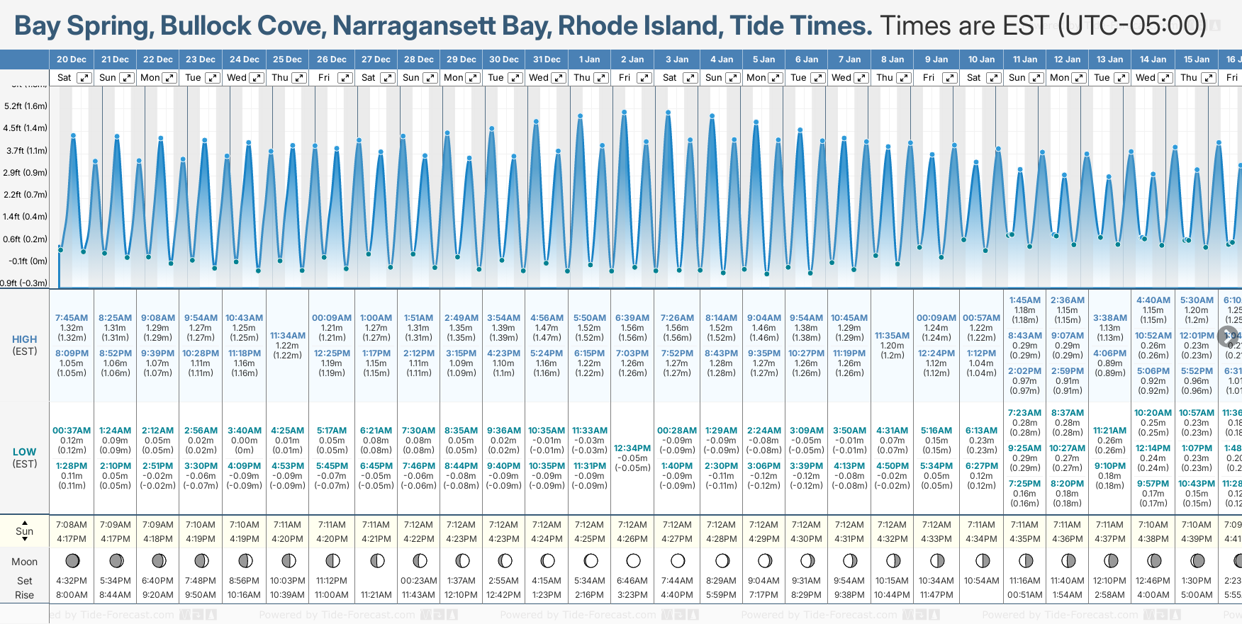 December and January Tide charts for Bay Spring, Bullock Cove, Narragansett Bay: The tide charts below show the height, time and date of high and low tides for the next 30 days.
