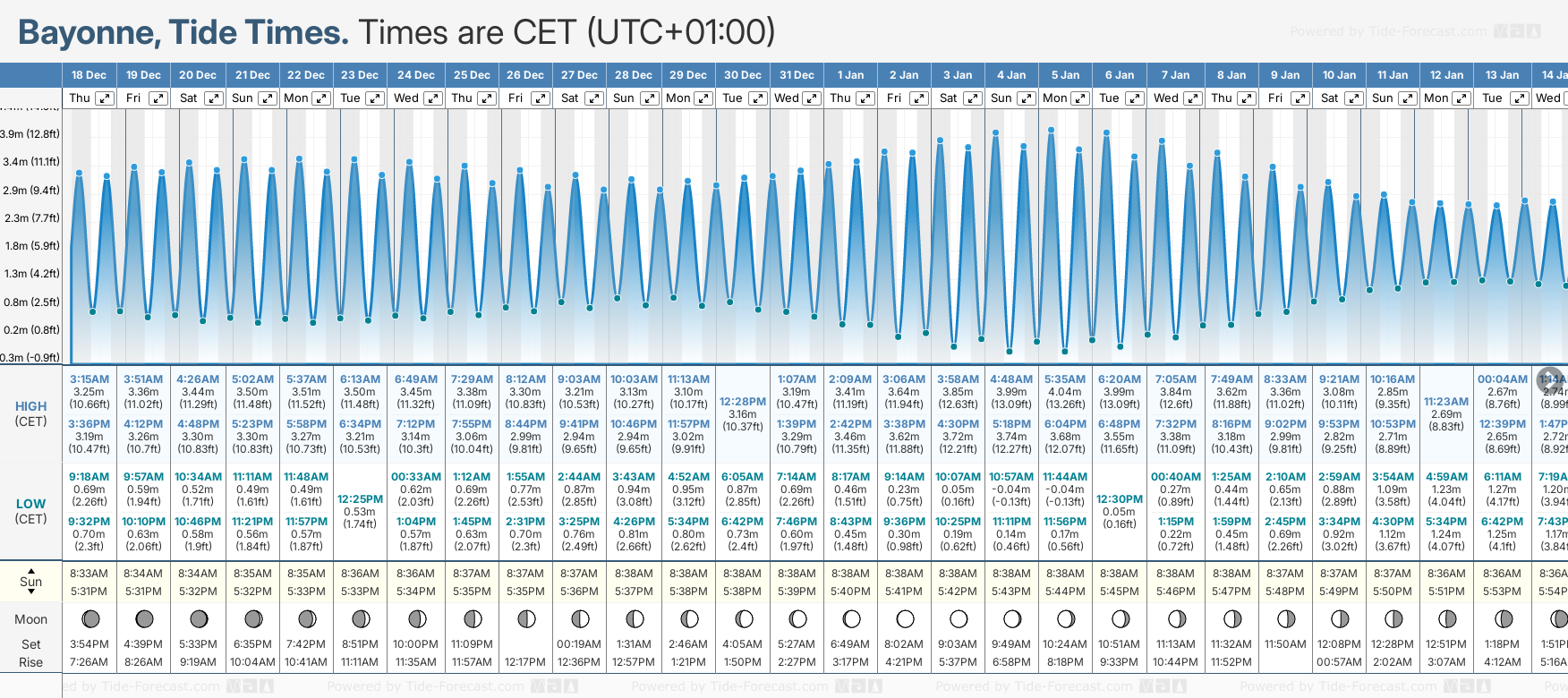 Tide Times are CET (UTC +1.0hrs). Last Spring High Tide at Bayonne was on Sat 06 Dec (height: 4.02m 13.2ft). Next high Spring Tide at Bayonne will be on Mon 22 Dec (height: 3.51m 11.5ft).