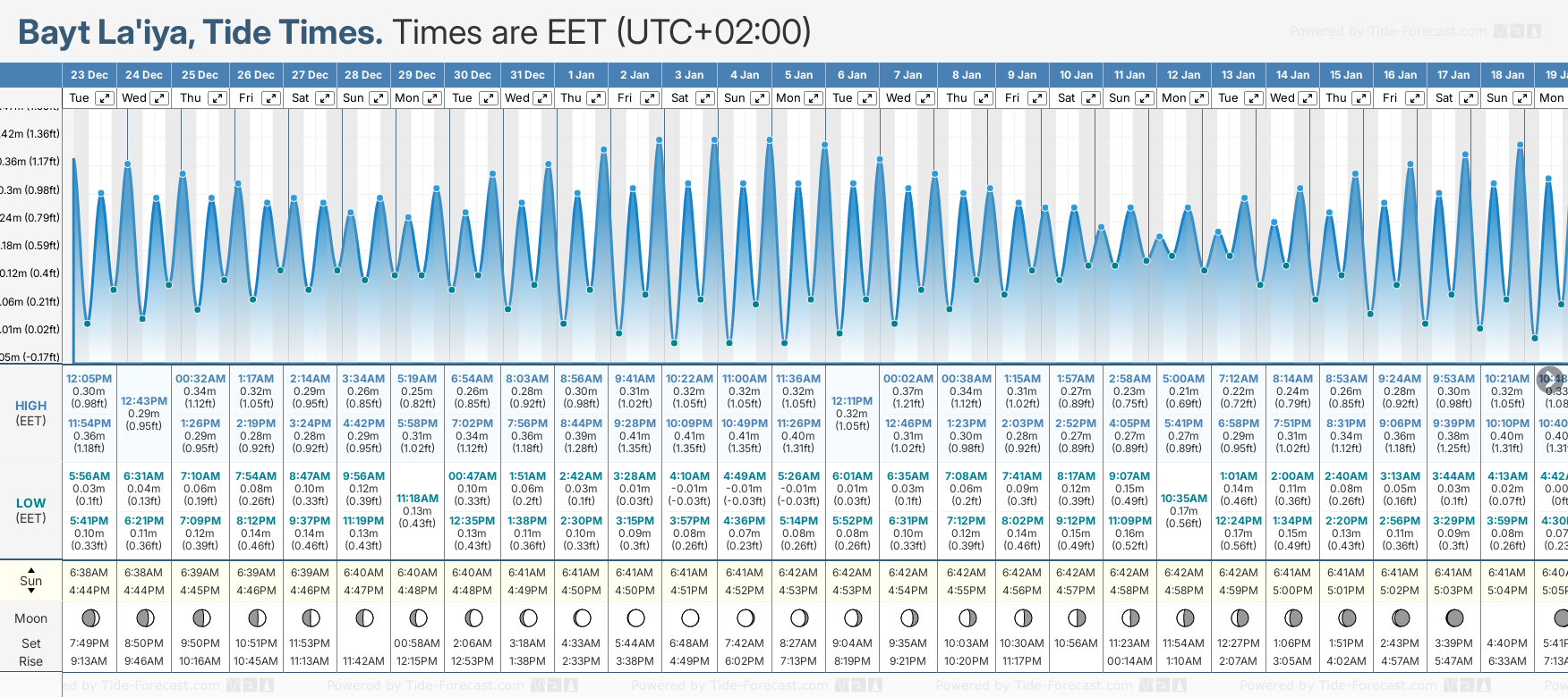 Tide Times are EET (UTC +2.0hrs). Last Spring High Tide at Bayt La'iya was on Sun 21 Dec (height: 0.38m 1.2ft). Next high Spring Tide at Bayt La'iya will be on Fri 02 Jan (height: 0.41m 1.3ft).