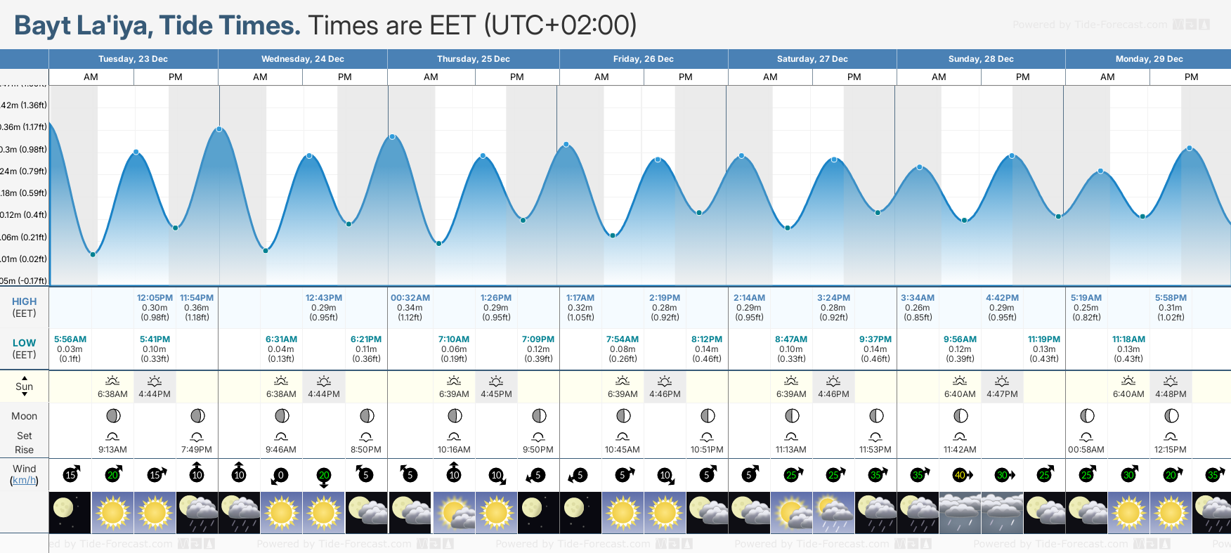 December and January Tide charts for Bayt La'iya: The tide charts below show the height, time and date of high and low tides for the next 30 days.
