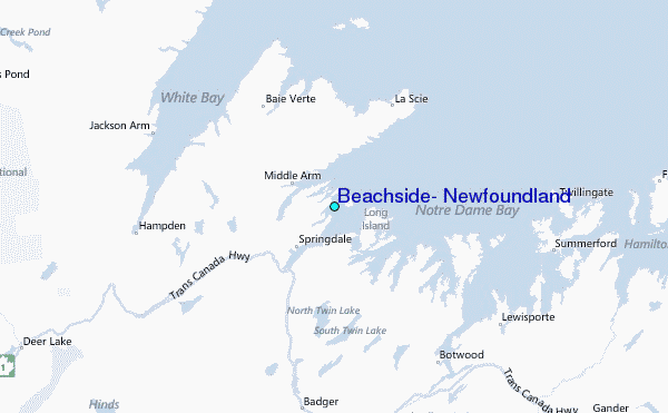Use this relief map to navigate to tide stations, surf breaks and cities that are in the area of Beachside, Newfoundland.