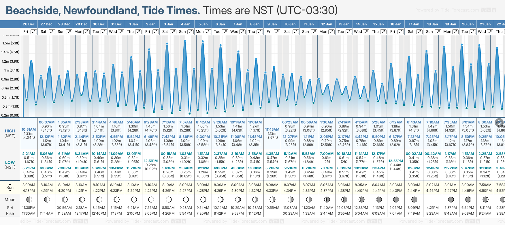 Tide Times are NST (UTC -3.5hrs). Last Spring High Tide at Beachside was on Tue 23 Dec (height: 1.48m 4.9ft). Next high Spring Tide at Beachside will be on Sun 04 Jan (height: 1.61m 5.3ft).