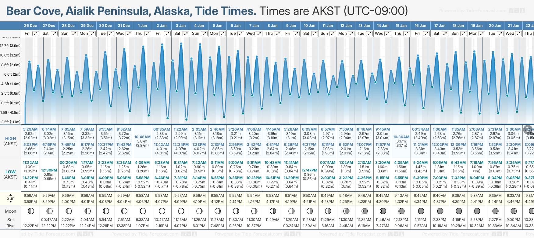 December and January Tide charts for Bear Cove, Aialik Peninsula: The tide charts below show the height, time and date of high and low tides for the next 30 days.