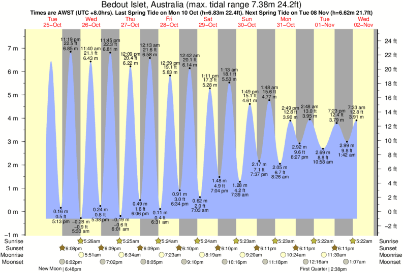 Tide Times are AWST (UTC +8.0hrs). Last Spring High Tide at Bedout Islet was on Fri 05 Dec (height: 6.68m 21.9ft). Next high Spring Tide at Bedout Islet will be on Sun 04 Jan (height: 6.51m 21.4ft).