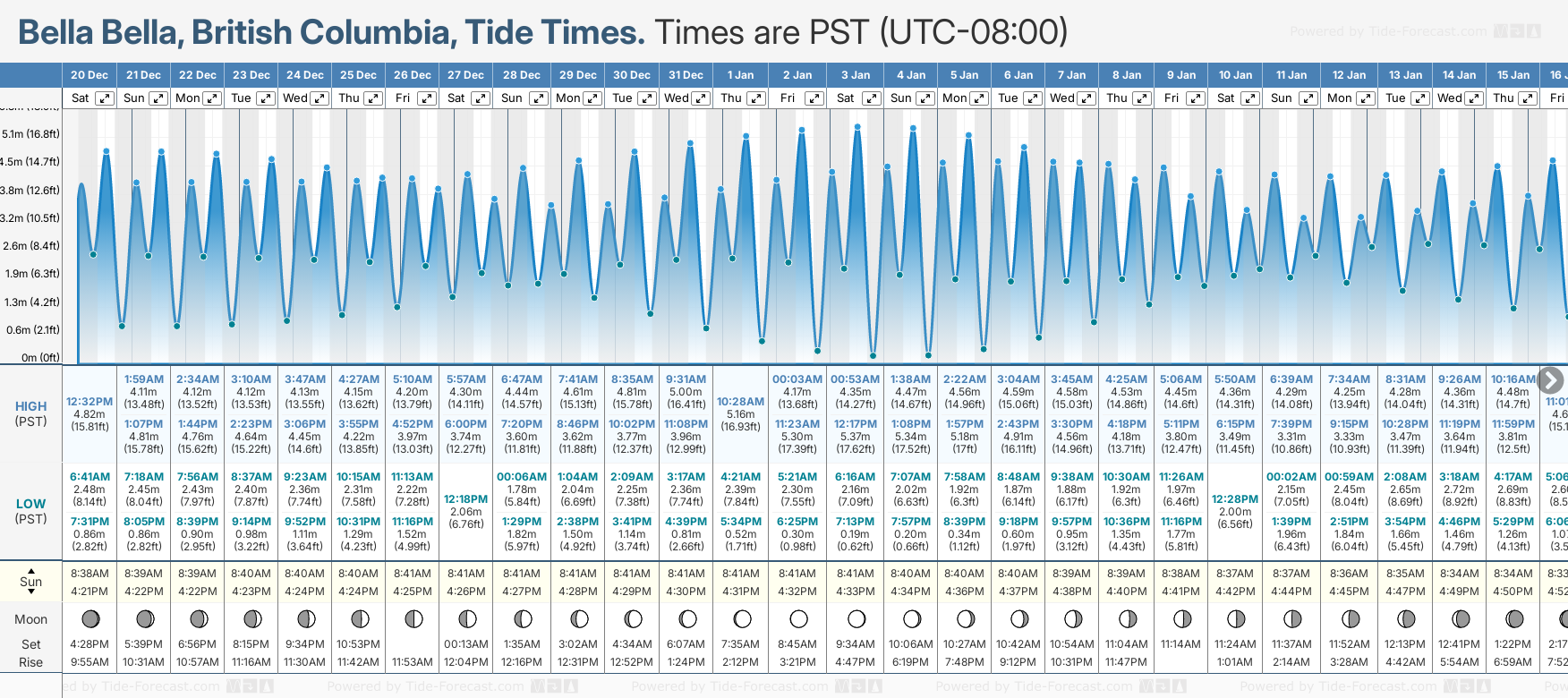 Tide Times are PST (UTC -8.0hrs). Last Spring High Tide at Bella Bella was on Sat 20 Dec (height: 4.82m 15.8ft). Next high Spring Tide at Bella Bella will be on Sat 03 Jan (height: 5.37m 17.6ft).