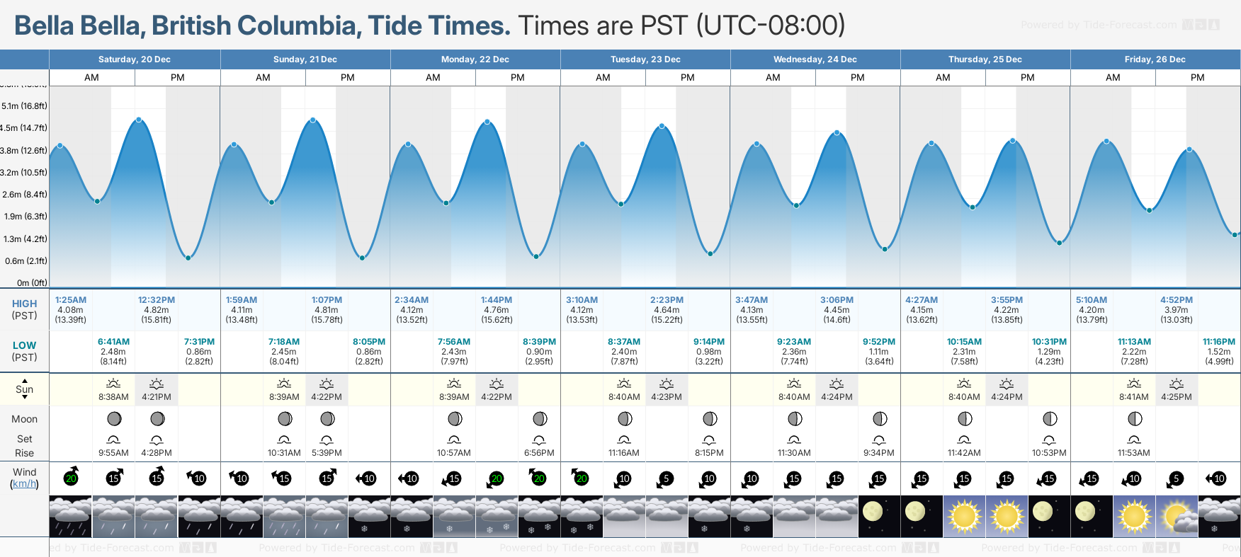 December and January Tide charts for Bella Bella: The tide charts below show the height, time and date of high and low tides for the next 30 days.