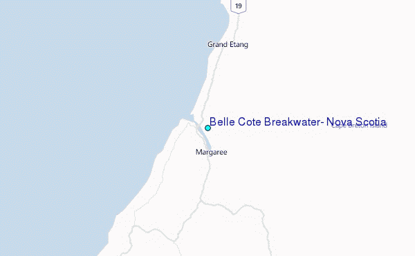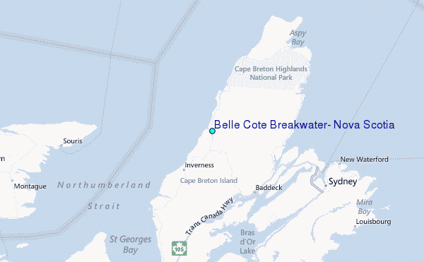 Use this relief map to navigate to tide stations, surf breaks and cities that are in the area of Belle Cote Breakwater, Nova Scotia.