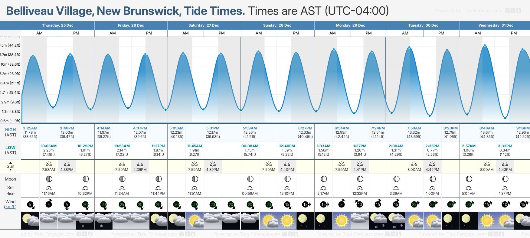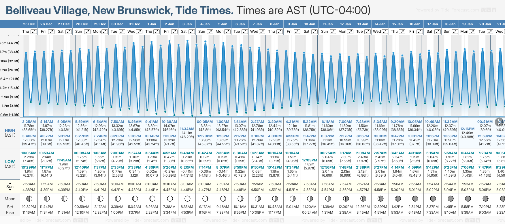 Tide Times are AST (UTC -4.0hrs). Last Spring High Tide at Belliveau Village was on Sun 21 Dec (height: 12.11m 39.7ft). Next high Spring Tide at Belliveau Village will be on Sat 03 Jan (height: 14.11m 46.3ft).