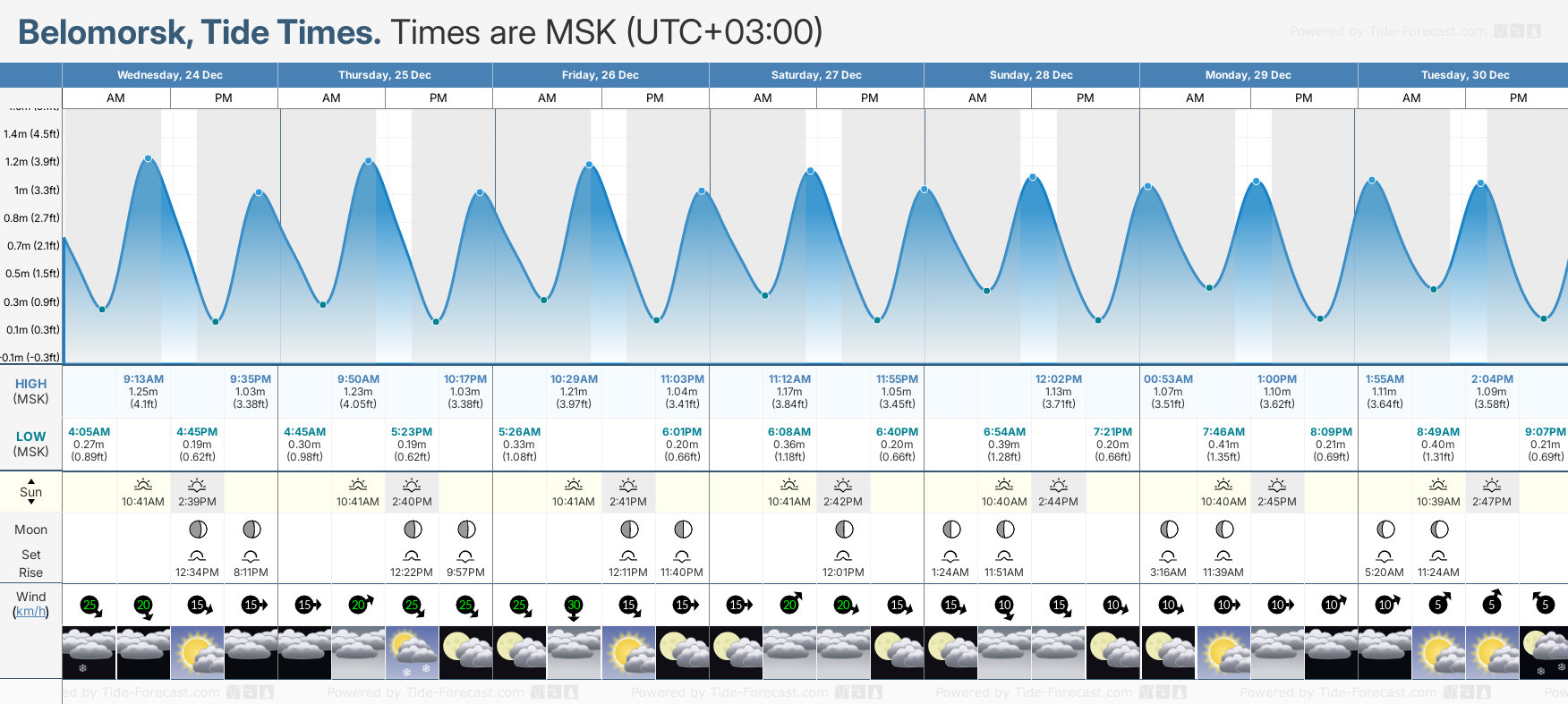 December and January Tide charts for Belomorsk: The tide charts below show the height, time and date of high and low tides for the next 30 days.