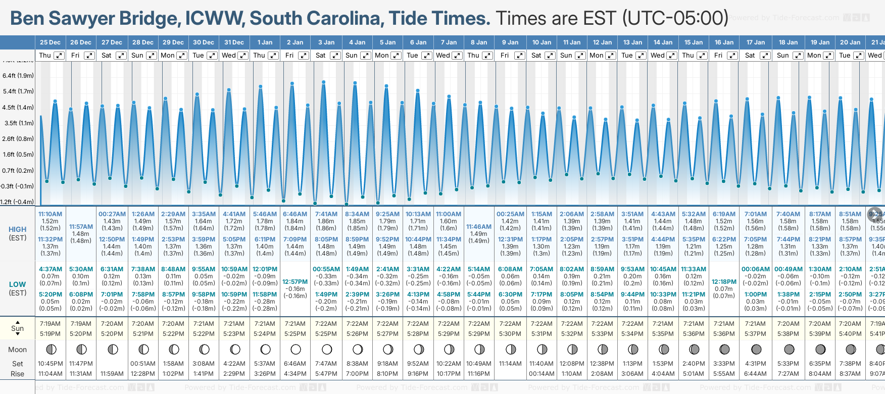 December and January Tide charts for Ben Sawyer Bridge, ICWW: The tide charts below show the height, time and date of high and low tides for the next 30 days.