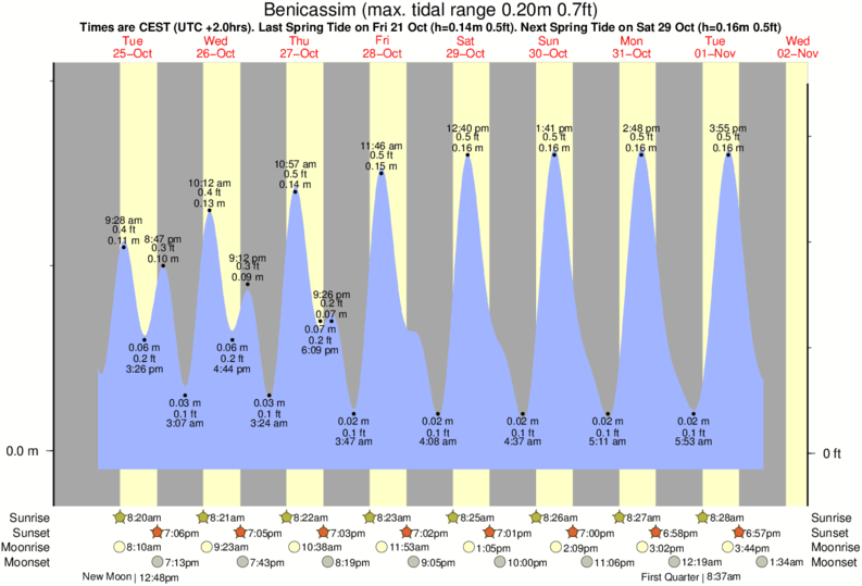 Tide Times are CET (UTC +1.0hrs). Last Spring High Tide at Benicassim was on Mon 08 Dec (height: 0.19m 0.6ft). Next high Spring Tide at Benicassim will be on Sun 21 Dec (height: 0.17m 0.6ft).