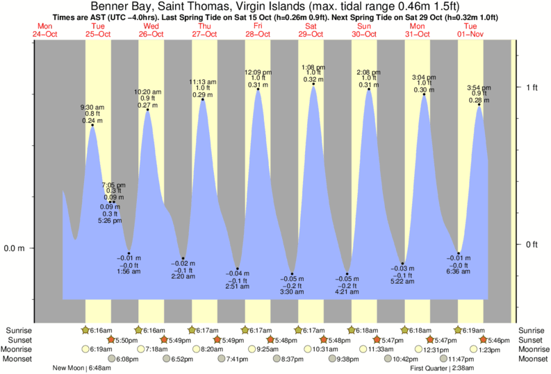 Tide Times are AST (UTC -4.0hrs). Last Spring High Tide at Benner Bay, Saint Thomas was on Fri 05 Dec (height: 0.37m 1.2ft). Next high Spring Tide at Benner Bay, Saint Thomas will be on Sun 21 Dec (height: 0.30m 1.0ft).