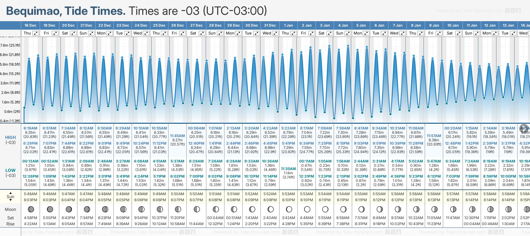 December and January Tide charts for Bequimao: The tide charts below show the height, time and date of high and low tides for the next 30 days.