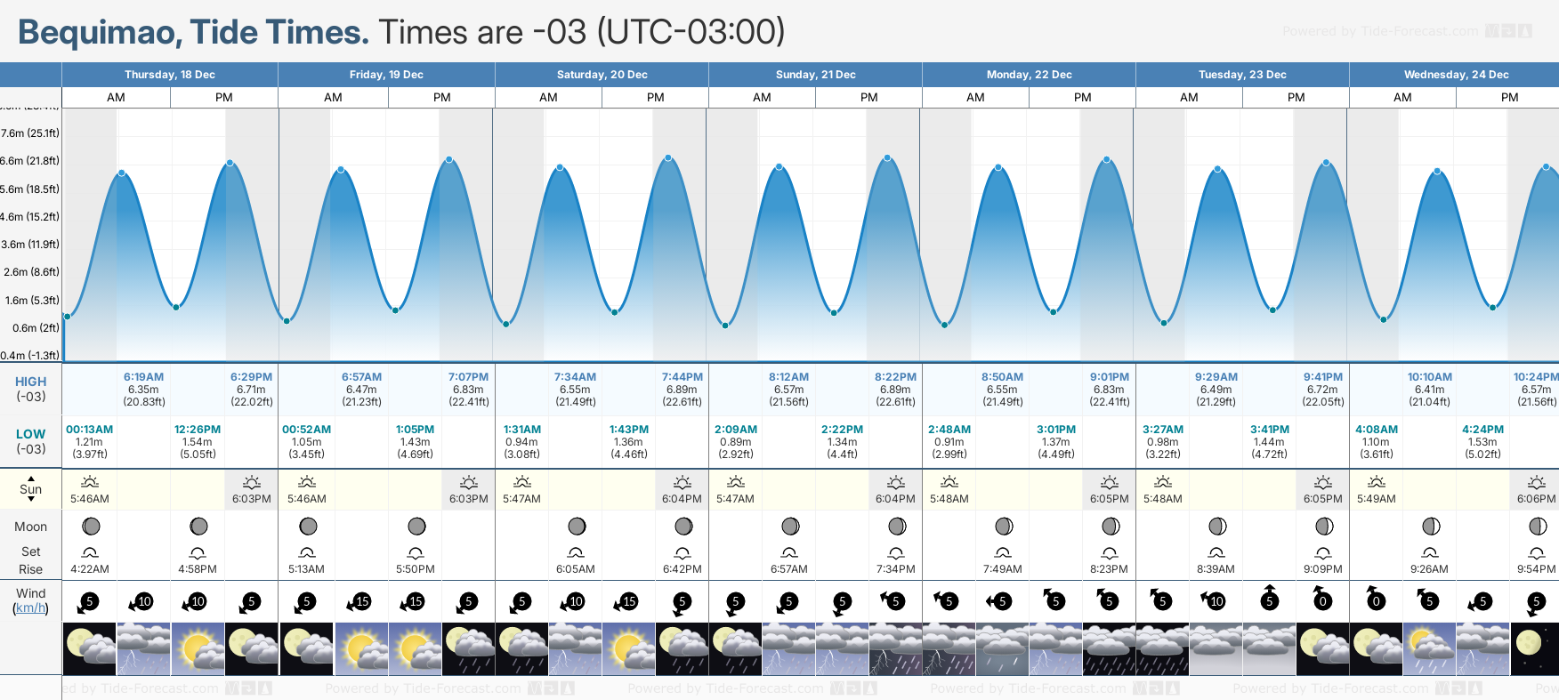 | High Tide | 7:07 PM(Fri 19 December) | 22.41 ft (6.83 m) |