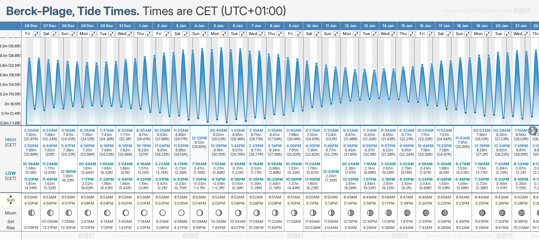 December and January Tide charts for Berck-Plage: The tide charts below show the height, time and date of high and low tides for the next 30 days.