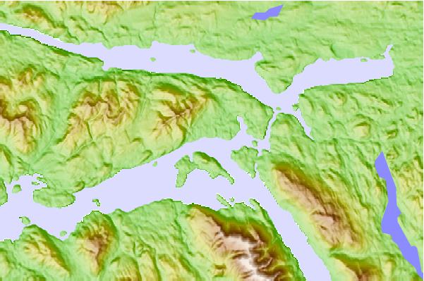 Use this relief map to navigate to tide stations, surf breaks and cities that are in the area of Bergh Cove, British Columbia.