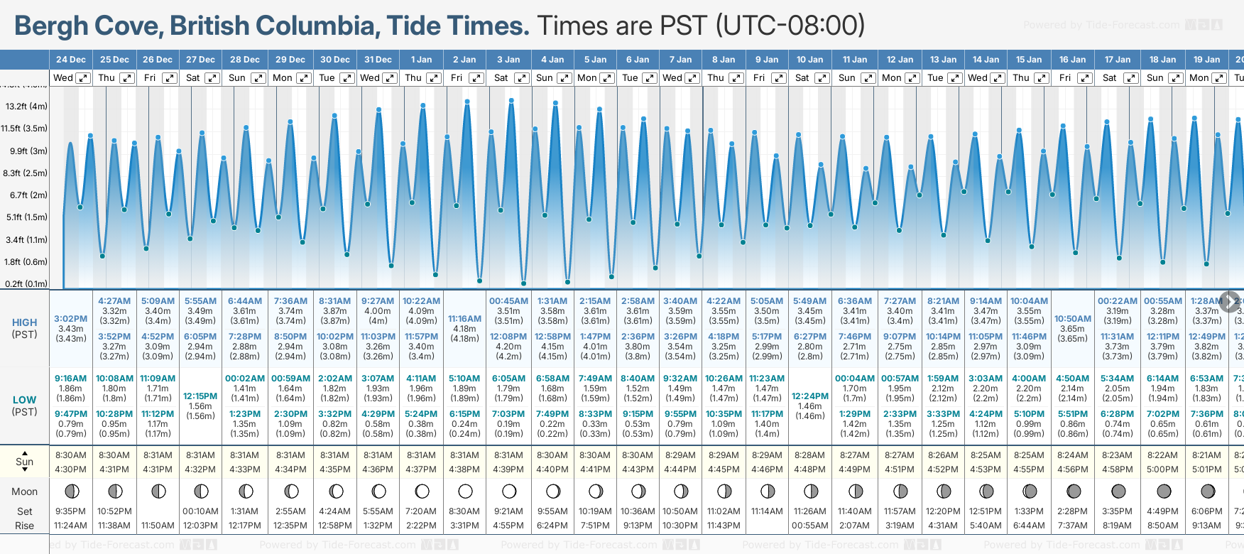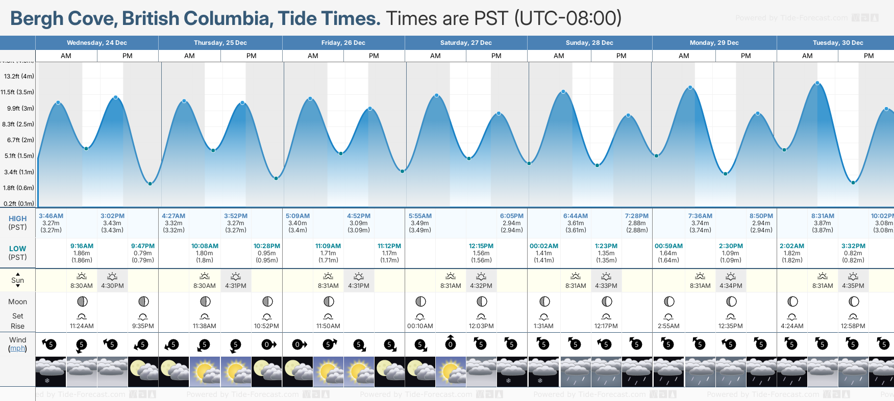 Tide Times are PST (UTC -8.0hrs). Last Spring High Tide at Bergh Cove was on Sun 21 Dec (height: 3.68m 12.1ft). Next high Spring Tide at Bergh Cove will be on Sat 03 Jan (height: 4.20m 13.8ft).
