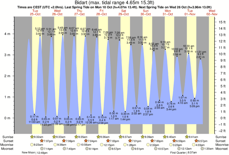 Tide Times are CET (UTC +1.0hrs). Last Spring High Tide at Bidart was on Sat 06 Dec (height: 4.03m 13.2ft). Next high Spring Tide at Bidart will be on Mon 22 Dec (height: 3.52m 11.5ft).