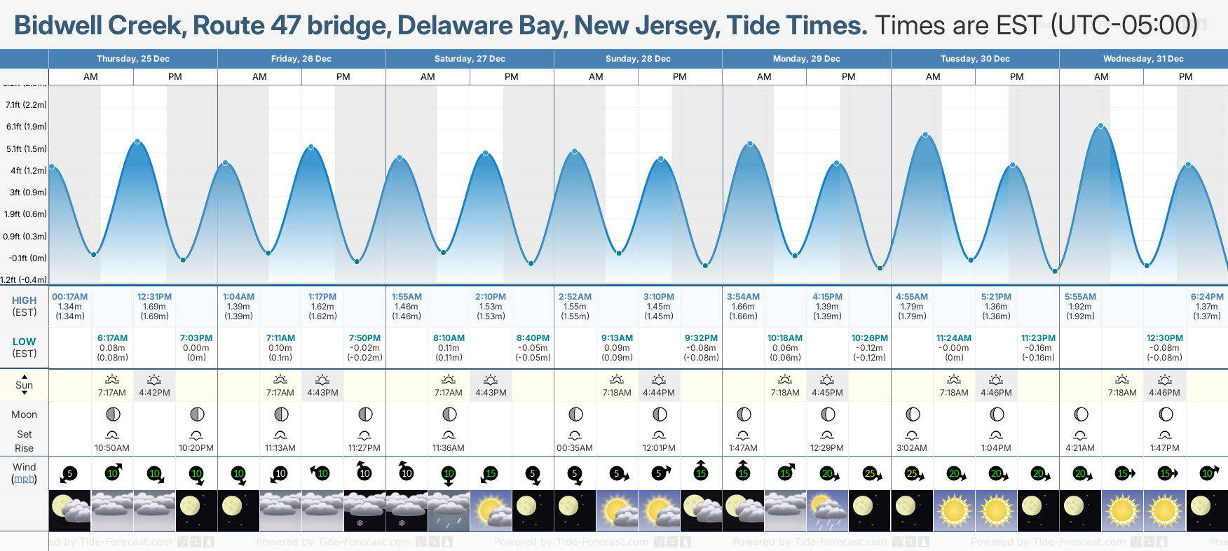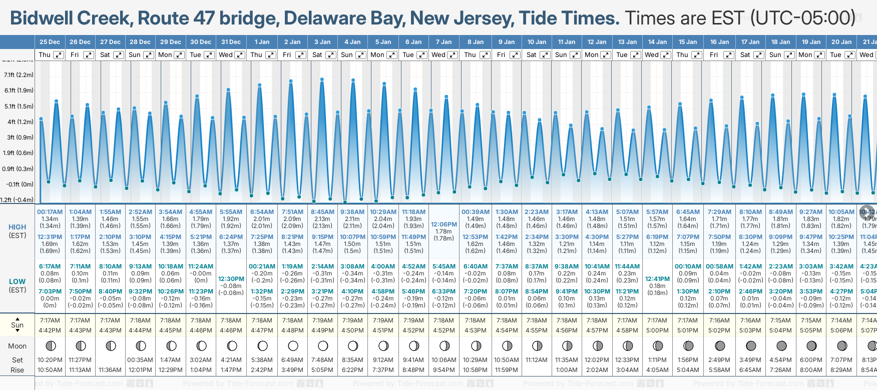 December and January Tide charts for Bidwell Creek, Route 47 bridge Bay: The tide charts below show the height, time and date of high and low tides for the next 30 days.